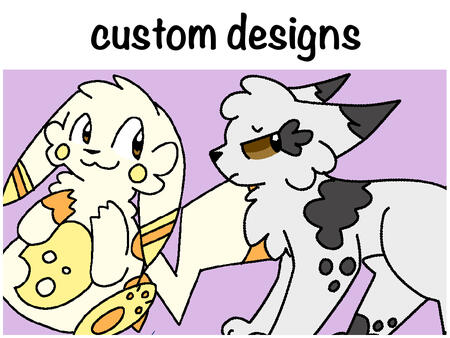 All custom designs cost $20.Currently I offer Pokemon (including variants and hybrids), Warrior Cats OC designs, and general animals.More of my designs can be find through Toyhouse.(Also as a note, I include some designs I made for canon Warriors characters just as examples here. I will not make designs for canon Warriors characters as a commission.)